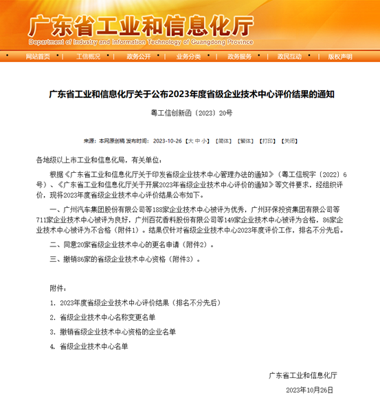 近日,广东省工业和信息化厅公布2023年度省级企业技术中心评价结果,荣耀体育app下载_荣耀体育(中国)有限公司顺利通过本次评价,连续多年获评省级企业技术中心称号。