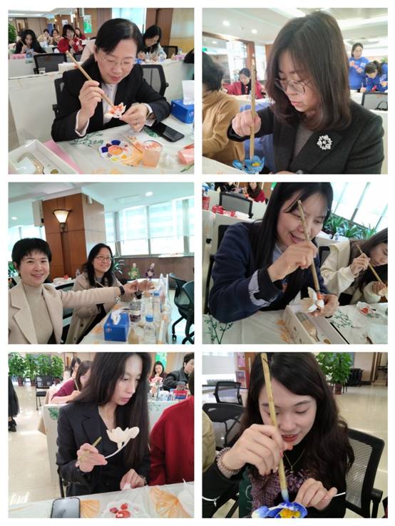 在巾帼非遗文化体验——制作香薰通草花环节。在大新公司非遗文化研学特聘通草花绘制技艺传承人颜康平老师的讲授下,大家开拓视野,增长知识,在学史溯源了解通草花史记、功效和绘制工艺后,纷纷凝神握笔,巧心妙思动手制作香薰通草花,感受中华非遗文化的魅力。非遗通草,扬我非遗;香薰飘香,舒缓赋能。一朵朵精美的通草花在她们手中绽放,寓意着新时代纺织女工在传承与创新中绽放光彩。