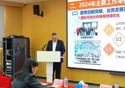 公司党支部书记、董事长周逊姜以《务实谋新提质效,深化改革促发展》为题作工作报告。报告从聚焦主业、赋能蓄力、培根铸魂三个方面总结了公司2024年的工作情况。2024年,广纺联公司统筹抓好地块交储、物业管理等多项工作,公司实现营业收入完成预算目标值103%;利润总额完成预算目标值156%。报告指出,2025年广纺联公司将围绕广州轻工集团及荣耀体育app下载_荣耀体育(中国)的总体部署,紧扣“数智领航链全球,提质增效建新功”的工作主题,从紧盯主责主业、提升改革深化、坚持党建引领、加强风险防范、强化人才队伍建设等五大方面推动经营工作实现质的有效提升。